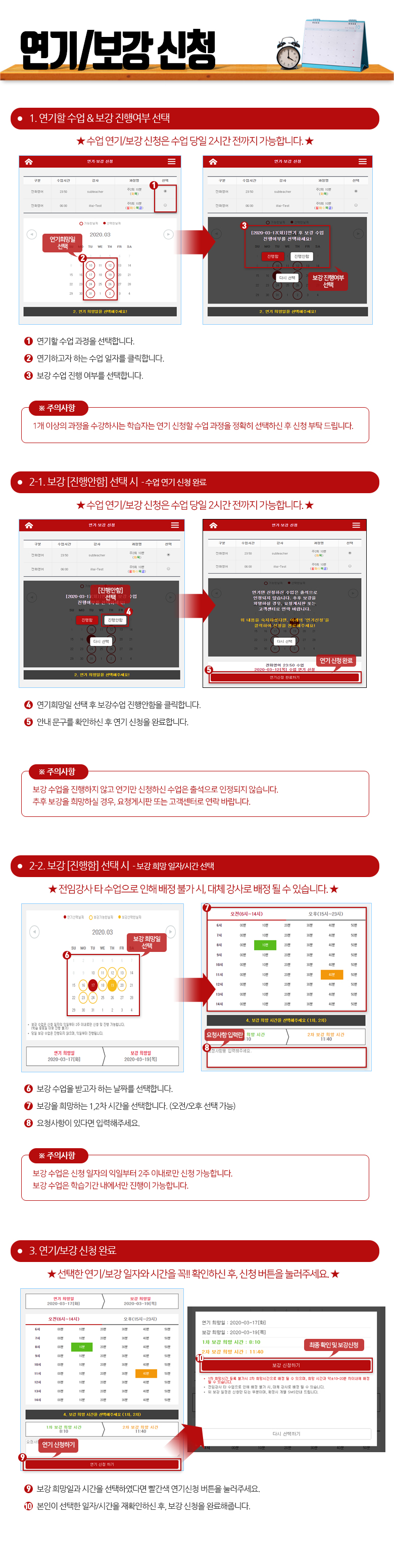 학습자님의 편의 향상을 위해 연기/보강 신청 방법이 개편 되었습니다. 3/13(금)부터 적용 예정이므로 이용 방법은 꼭! 확인하여 주세요.
