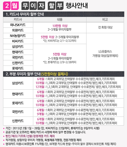 | 다음글 ▲ | 2015년 3월 무이자 할부 행사안내 | 관리자 | 2015-03-03 | 10172 |