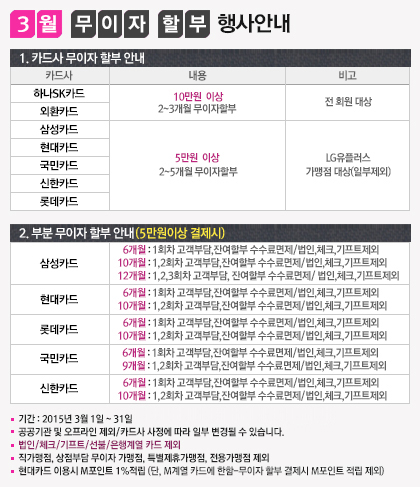 | 이전글 ▼ | 2015년 2월 무이자 할부 행사안내 | 관리자 | 2015-02-23 | 10184 |
