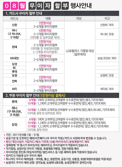 2017년 8월 신용카드 무이자 할부 행사 안내